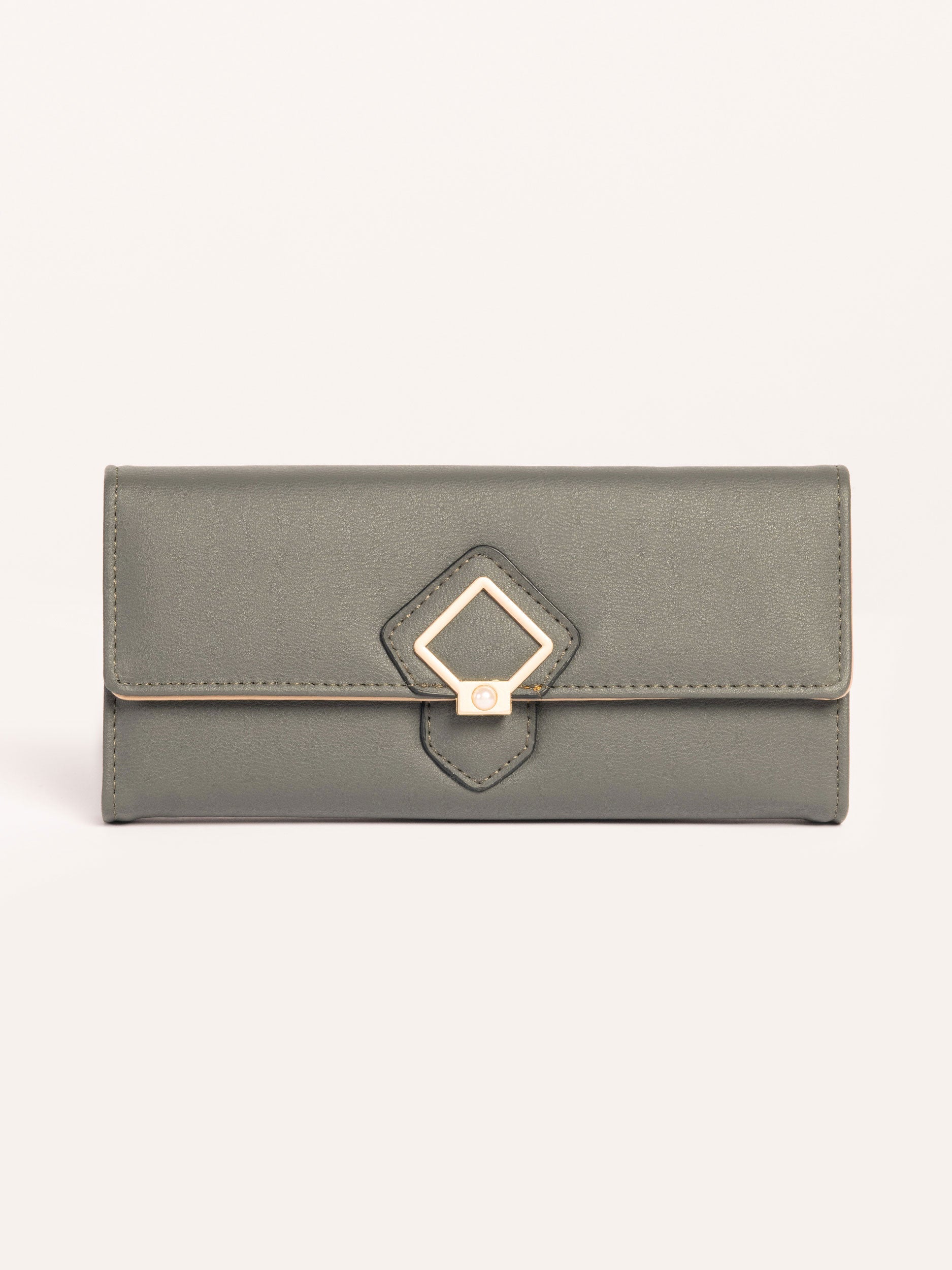 - Dull gold metallic diamond shaped logo with pearl embellishment on the flap
