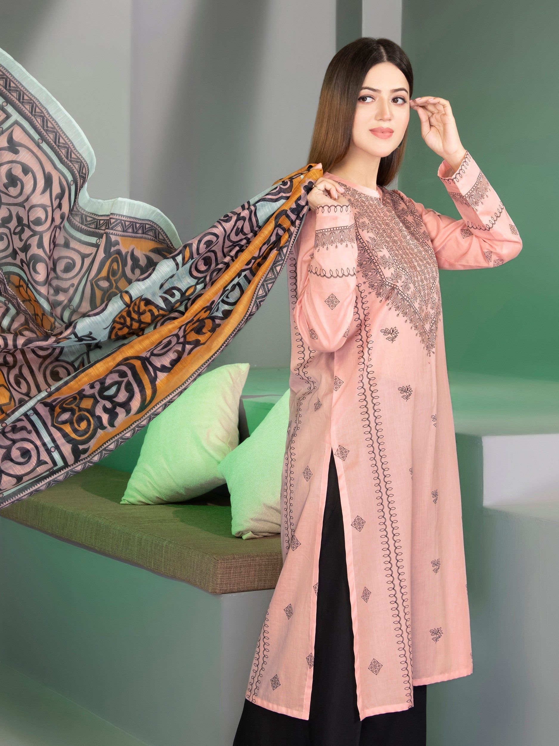 - Soft tone of multi-colored print on the dupatta